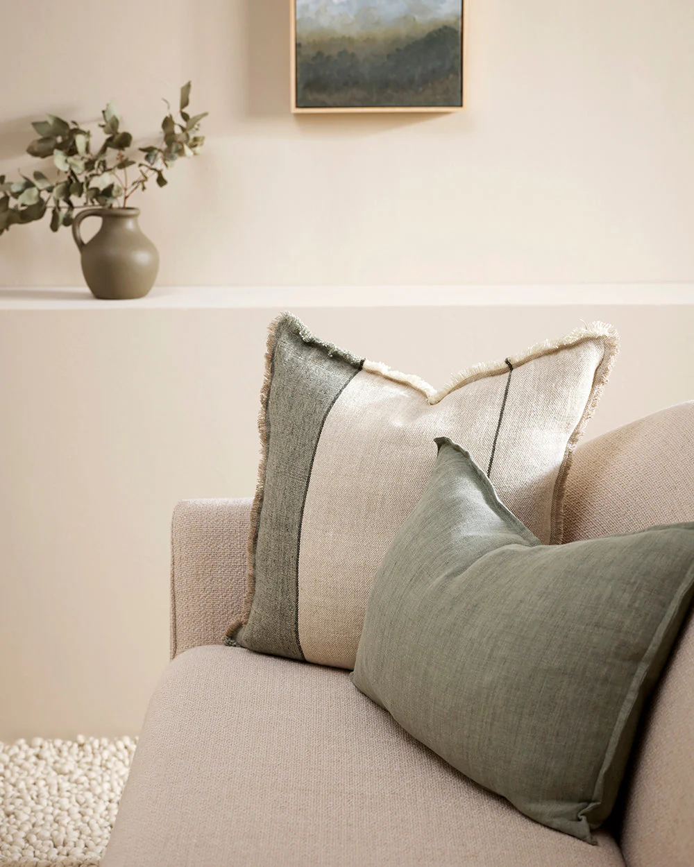 Country charm is given a contemporary twist, with the raw fringing and understated texture of our Frankton cushion. Crafted from thick, textural linen, the asymmetric design creates a modern take on classic style. Shades of ecru and sage create a relaxed feel, and pair effortlessly with Cyprian Oatmeal and Arcadia Sage cushions.